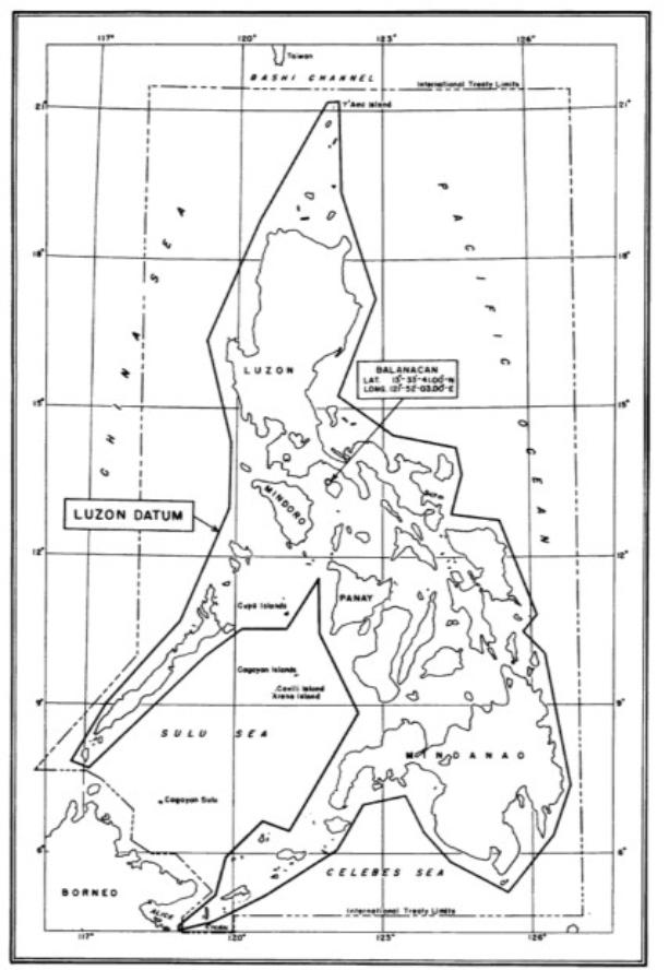| Historical Background The triangulation in the Philippine Archipelago developed along the same lines as the triangulation in the United States. Military and commercial considerations necessitated the beginning of work at different points throughout the islands, each control scheme being on its own geodetic datum as determined by astronomic observations connected with that particular scheme. Later these surveys were brought together on what was known as the Vigan datum. This datum answered the purpose for a time, but as the triangulation was extended to the south and embraced additional astronomic stations, it was found necessary to establish a new datum so that no serious errors would occur in any part of the system. The Luzon Datum This datum was adopted in 1911 and received its name from the fact that it is derived wholly from observations on Luzon Island, although supplemented by theoretical inference and approximate results from other regions. While this was an attempt to establish a Philippine datum, the incompleteness of the available data made it unwise to adopt the latter name. The Luzon datum is defined in terms of the coordinates of Station Balanacan in Marinduque Province as computed on the Clarke Spheroid of 1866 as follows: Latitude: 13 degrees 33 minutes 41700 seconds North Longitude: 121 degrees 52 minutes 03700 seconds East Azimuth to Baltazar: 9 degrees 12 minutes 37700 seconds |