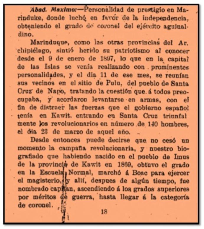 | ABAD AS CAPTAIN OF THE MARINDUQUE REVOLUTIONARY FORCE Serving as a teacher and at the same time, a revolutionary officer under the army of Aguinaldo, who labored with other Katipunan officials in Marinduque to recruit other members and establish chapters in the different pueblos of the island, he was conferred the rank of Captain on February 1899. Maximo Abad was later promoted from Captain to Colonel due to his outstanding accomplishments in the revolutionary force |