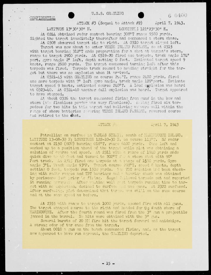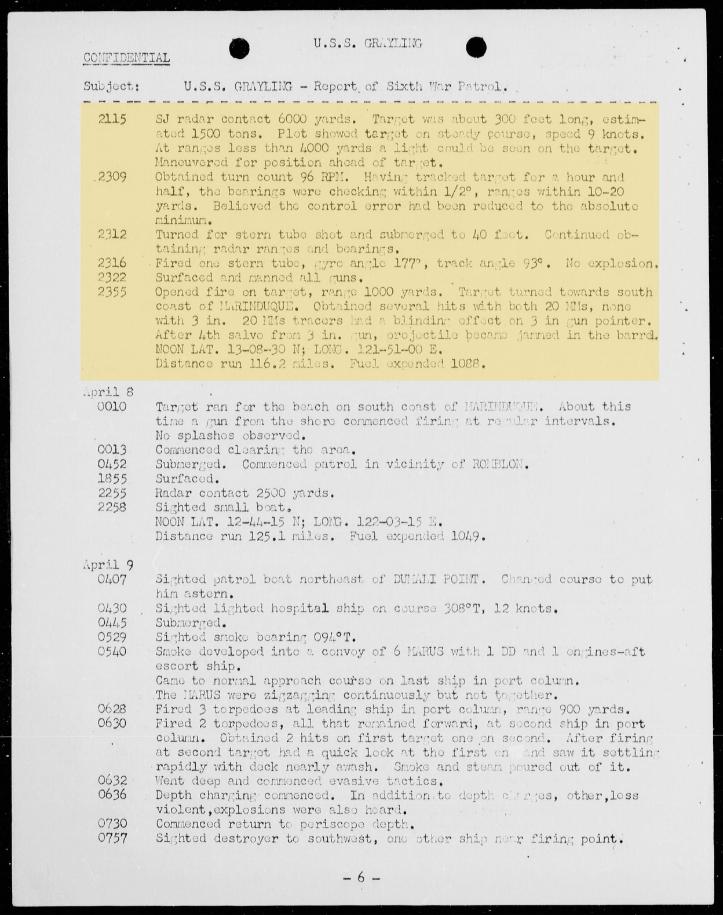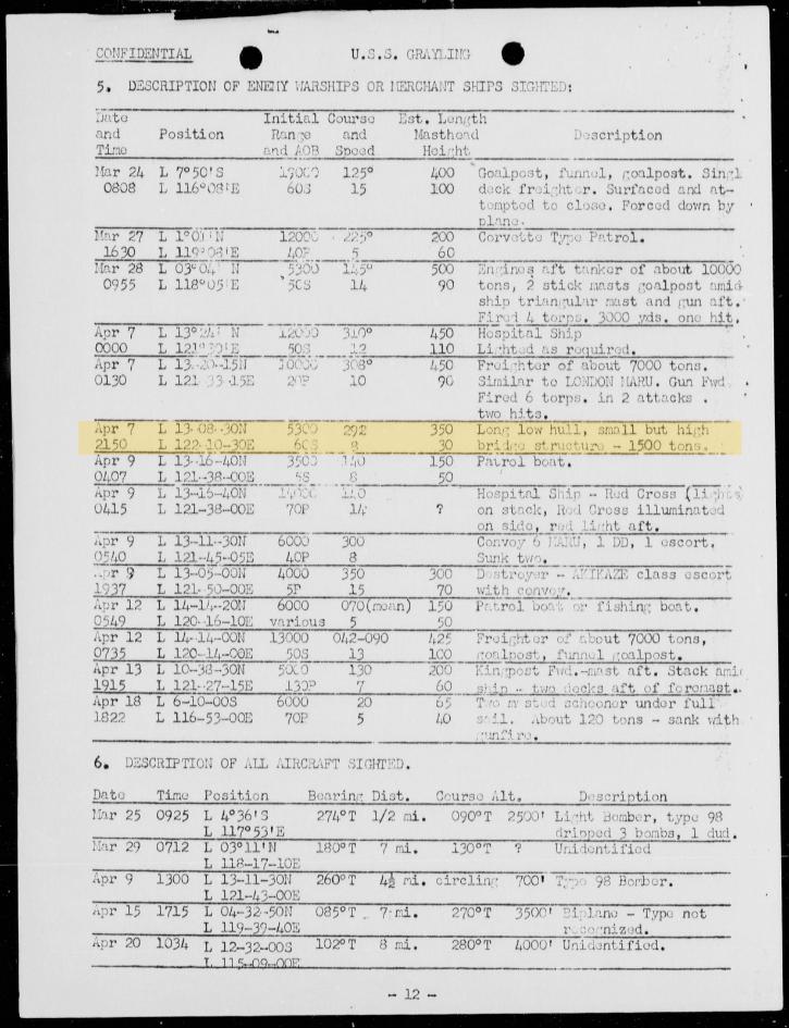 Philippines area, Grayling recorded her last kill, the passenger-cargo Meizan Maru on