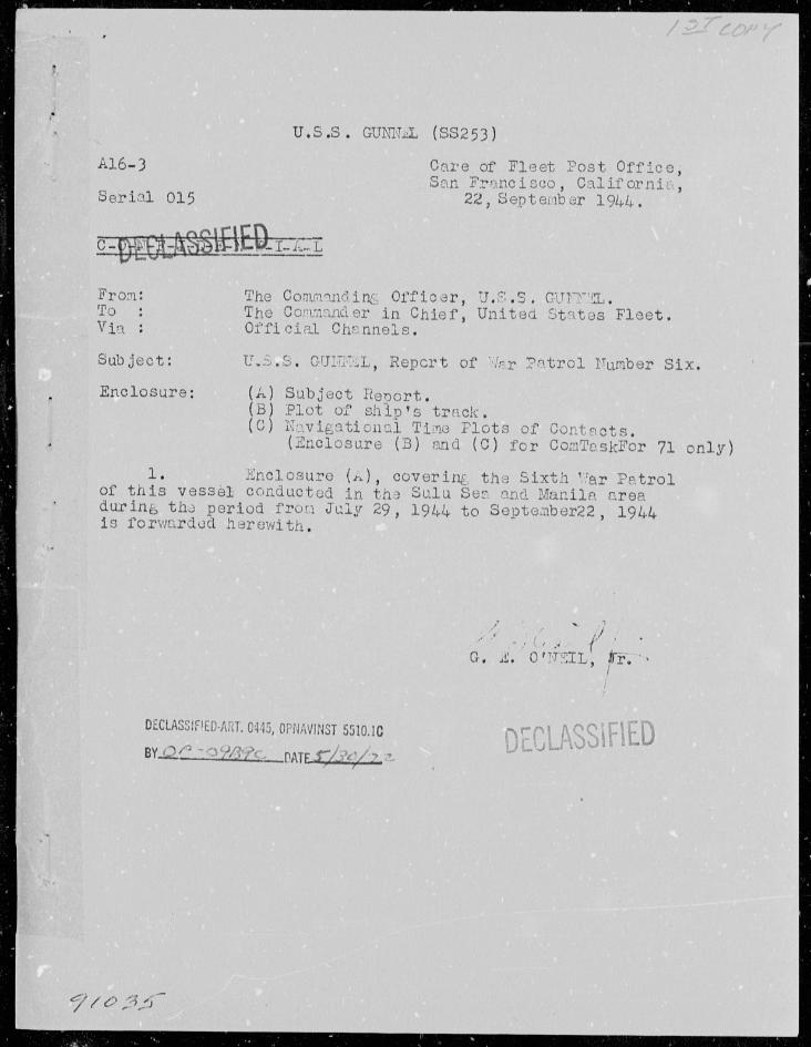 USS GUNNEL SS-253 Report of War Patrol 6 July 29 1944 to September 22 1944