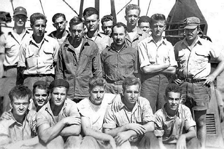 Back row, left to right: Lt. (jg) J. W. Jeffrey (Texas), Ens. A. Fleischer (Pa), C. H. Lloyd RM