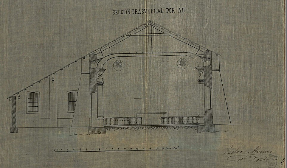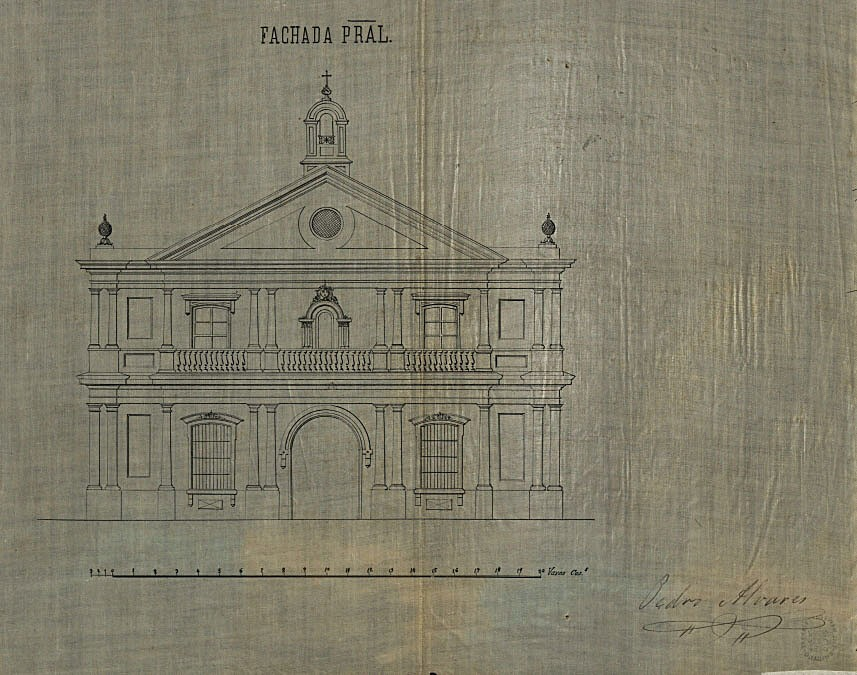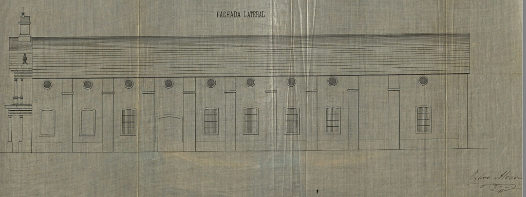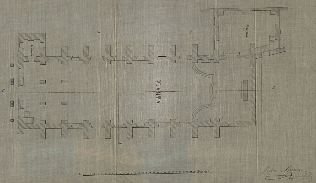 It is a floor plan, front elevation, cross section, and 2 lateral elevations of the Boac church Signed by Pedro Alvares and disbound from paper title page. Pen-and-ink. 5 technical drawings on cloth sheets 310 x 697 mm or smaller. The plans are undated.