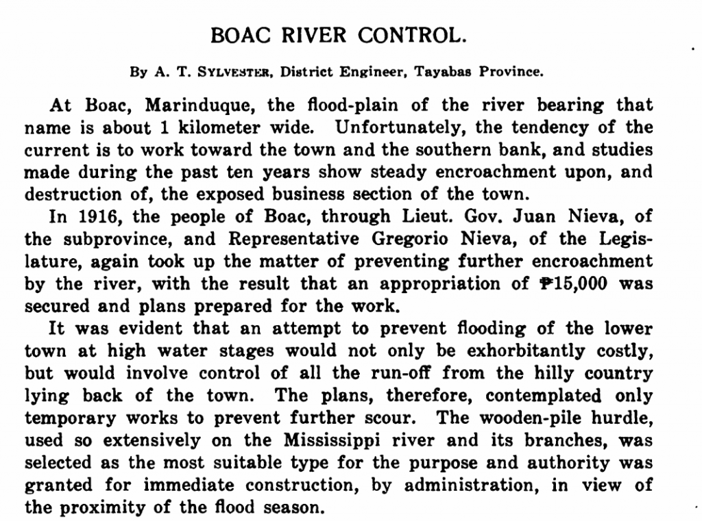 With all the concern these days about flood control projects, lets look at the 1916 attempt to control the Boac River with a 15,000 peso project.