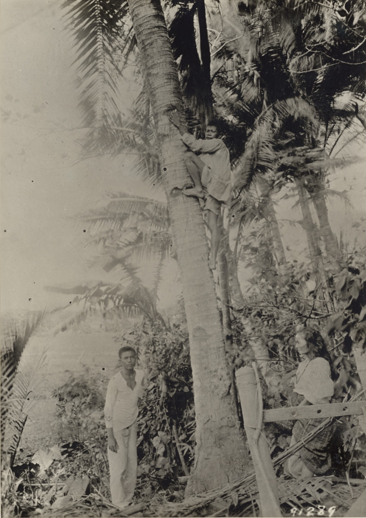 Natives in Marinduque, P.I. climbing cocoanut trees to collect “tuba”.