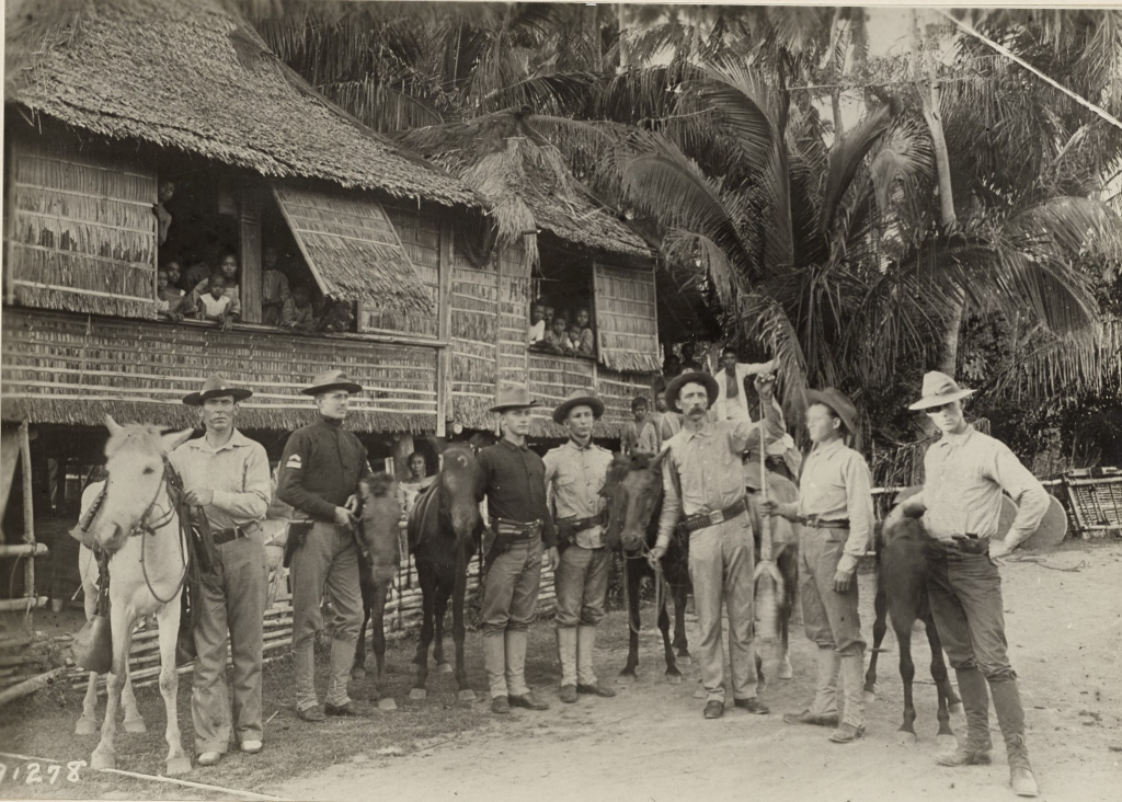 Mounted Scouting Party of Co. A, 1st Infantry leaving Boac, Marinduqe, P.I. 1st Lt. Campbell King 1st Inf. in center of picture with Van Dyke beard, Commander 1901