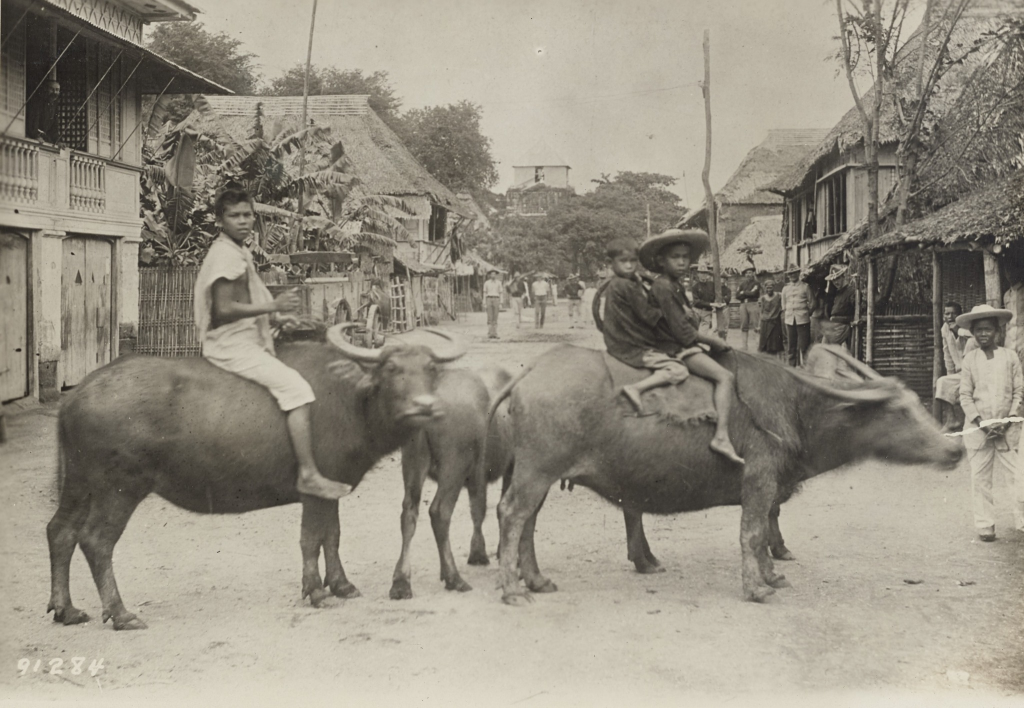 A street in Boac, Marinduque, P.I. 1901. 3 young boys riding their beasts of burden.